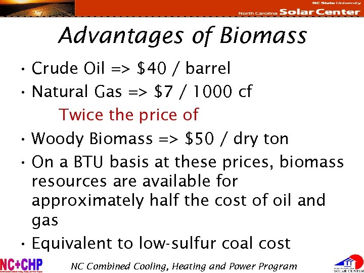 Advantages of Biomass • Crude Oil => $40 / barrel • Natural Gas => $7 / 1000 cf Twice the price of • Woody Biomass => $50 / dry ton • On a BTU basis at these prices, biomass resources are available for approximately half the cost of oil and gas • Equivalent to low-sulfur coal cost NC Combined Cooling, Heating and Power Program