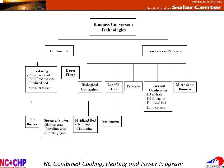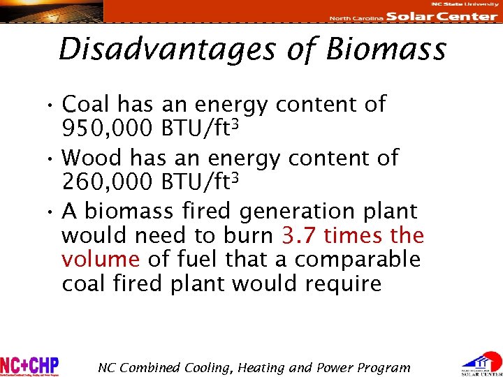 Disadvantages of Biomass • Coal has an energy content of 950, 000 BTU/ft 3 • Wood has an energy content of 260, 000 BTU/ft 3 • A biomass fired generation plant would need to burn 3. 7 times the volume of fuel that a comparable coal fired plant would require NC Combined Cooling, Heating and Power Program