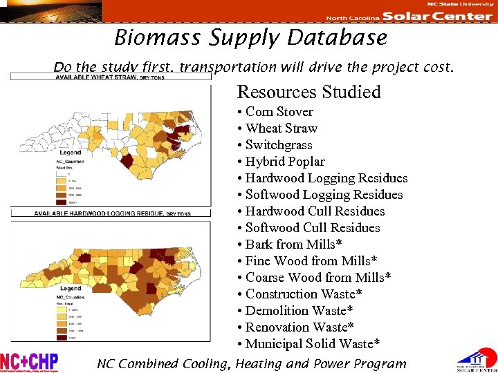 Biomass Supply Database Do the study first, transportation will drive the project cost. Resources Studied • Corn Stover • Wheat Straw • Switchgrass • Hybrid Poplar • Hardwood Logging Residues • Softwood Logging Residues • Hardwood Cull Residues • Softwood Cull Residues • Bark from Mills* • Fine Wood from Mills* • Coarse Wood from Mills* • Construction Waste* • Demolition Waste* • Renovation Waste* • Municipal Solid Waste* NC Combined Cooling, Heating and Power Program