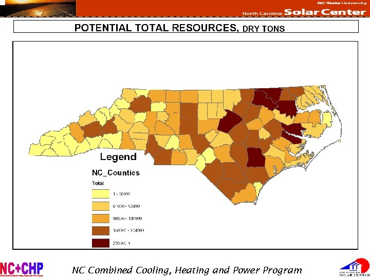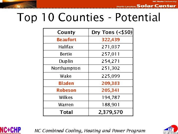Top 10 Counties - Potential County Dry Tons (<$50) Beaufort 322, 439 Halifax 271, 037 Bertie 257, 011 Duplin 254, 271 Northampton 251, 302 Wake 225, 099 Bladen 209, 383 Robeson 205, 341 Wilkes 194, 787 Warren 188, 901 Total 2, 379, 570 NC Combined Cooling, Heating and Power Program