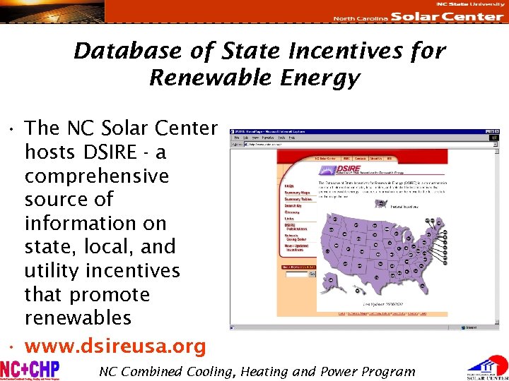 Database of State Incentives for Renewable Energy • The NC Solar Center hosts DSIRE - a comprehensive source of information on state, local, and utility incentives that promote renewables • www. dsireusa. org NC Combined Cooling, Heating and Power Program