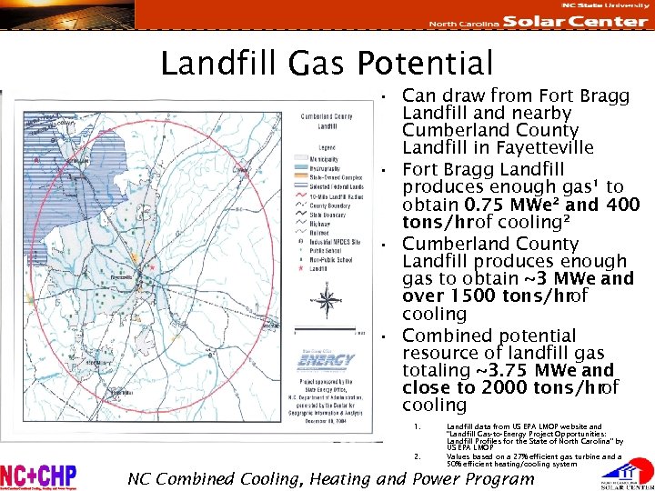 Landfill Gas Potential Landfill Locations from Fort Bragg • Can draw Landfill and nearby Cumberland County Landfill in Fayetteville • Fort Bragg Landfill produces enough gas¹ to obtain 0. 75 MWe² and 400 tons/hr of cooling² • Cumberland County Landfill produces enough gas to obtain ~3 MWe and over 1500 tons/hrof cooling • Combined potential resource of landfill gas totaling ~3. 75 MWe and close to 2000 tons/hr of cooling 1. 2. Landfill data from US EPA LMOP website and “Landfill Gas-to-Energy Project Opportunities: Landfill Profiles for the State of North Carolina” by US EPA LMOP Values based on a 27% efficient gas turbine and a 50% efficient heating/cooling system NC Combined Cooling, Heating and Power Program