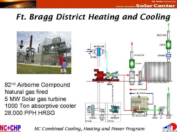Ft. Bragg District Heating and Cooling 82 nd Airborne Compound Natural gas fired 5 MW Solar gas turbine 1000 Ton absorptive cooler 28, 000 PPH HRSG NC Combined Cooling, Heating and Power Program