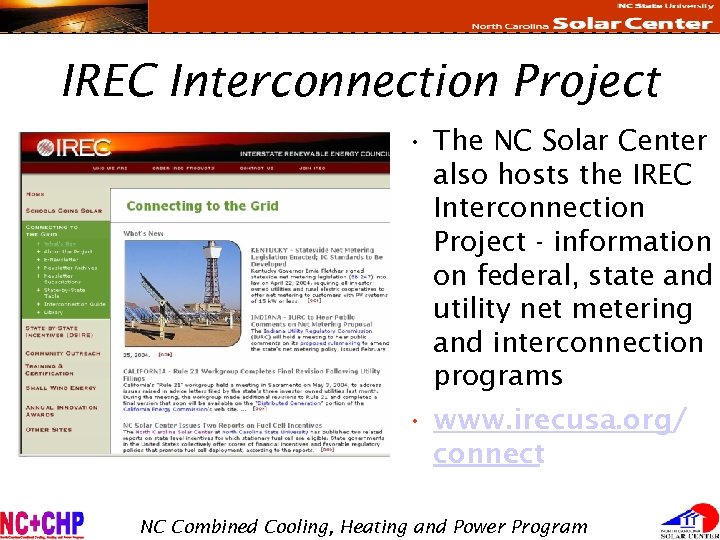 IREC Interconnection Project • The NC Solar Center also hosts the IREC Interconnection Project - information on federal, state and utility net metering and interconnection programs • www. irecusa. org/ connect NC Combined Cooling, Heating and Power Program