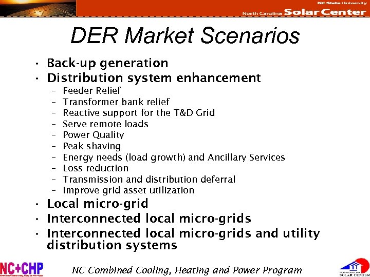 DER Market Scenarios • Back-up generation • Distribution system enhancement – – – – – Feeder Relief Transformer bank relief Reactive support for the T&D Grid Serve remote loads Power Quality Peak shaving Energy needs (load growth) and Ancillary Services Loss reduction Transmission and distribution deferral Improve grid asset utilization • Local micro-grid • Interconnected local micro-grids and utility distribution systems NC Combined Cooling, Heating and Power Program