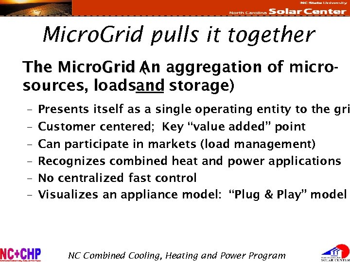 Micro. Grid pulls it together The Micro. Grid An aggregation of micro( sources, loadsand storage) – – – Presents itself as a single operating entity to the gri Customer centered; Key “value added” point Can participate in markets (load management) Recognizes combined heat and power applications No centralized fast control Visualizes an appliance model: “Plug & Play” model NC Combined Cooling, Heating and Power Program