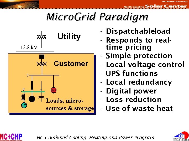 Micro. Grid Paradigm 13. 8 k. V 5 8 M 8 • Dispatchableload Utility • Responds to realtime pricing • Simple protection Customer • Local voltage control • UPS functions • Local redundancy M 5 • Digital power • Loss reduction Loads, microsources & storage • Use of waste heat NC Combined Cooling, Heating and Power Program