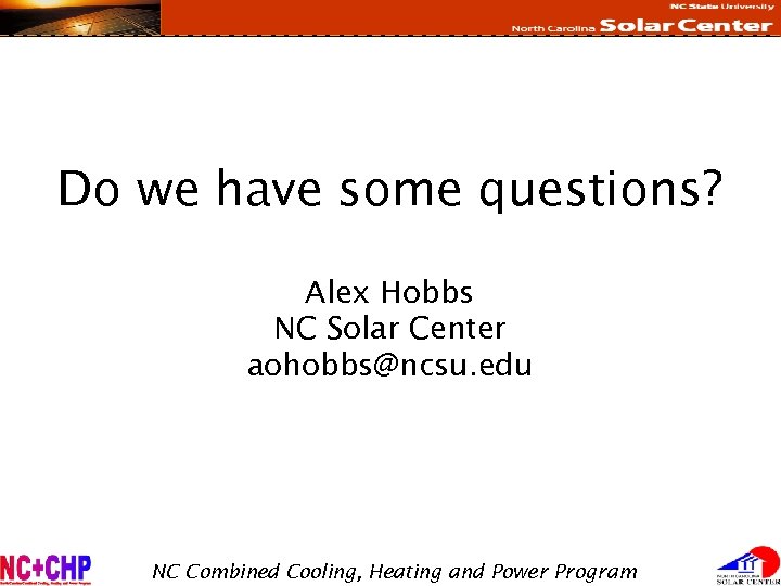 Do we have some questions? Alex Hobbs NC Solar Center aohobbs@ncsu. edu NC Combined Cooling, Heating and Power Program