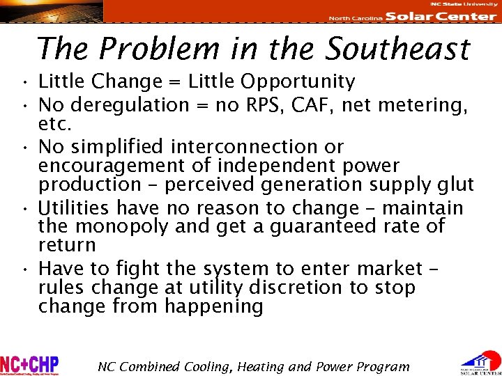 The Problem in the Southeast • Little Change = Little Opportunity • No deregulation = no RPS, CAF, net metering, etc. • No simplified interconnection or encouragement of independent power production – perceived generation supply glut • Utilities have no reason to change – maintain the monopoly and get a guaranteed rate of return • Have to fight the system to enter market – rules change at utility discretion to stop change from happening NC Combined Cooling, Heating and Power Program