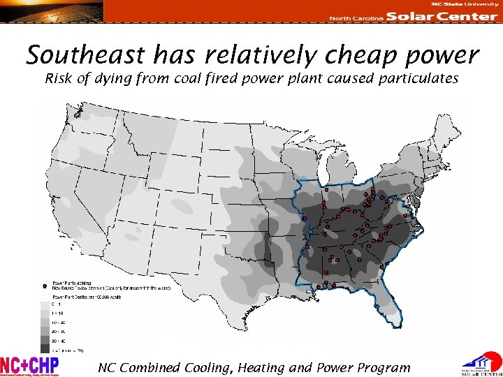 Southeast has relatively cheap power Risk of dying from coal fired power plant caused particulates Source: Clean Air Task Force NC Combined Cooling, Heating and Power Program