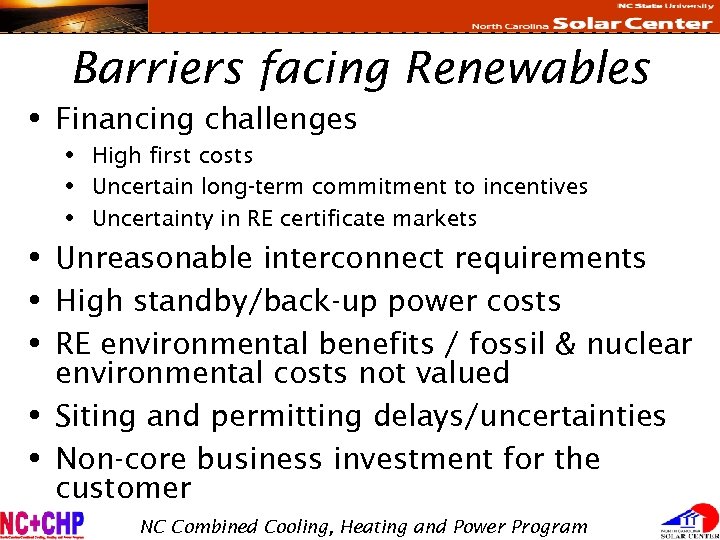 Barriers facing Renewables Financing challenges High first costs Uncertain long-term commitment to incentives Uncertainty in RE certificate markets Unreasonable interconnect requirements High standby/back-up power costs RE environmental benefits / fossil & nuclear environmental costs not valued Siting and permitting delays/uncertainties Non-core business investment for the customer NC Combined Cooling, Heating and Power Program