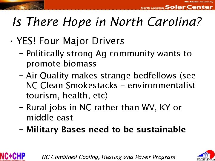 Is There Hope in North Carolina? • YES! Four Major Drivers – Politically strong Ag community wants to promote biomass – Air Quality makes strange bedfellows (see NC Clean Smokestacks – environmentalist tourism, health, etc) – Rural jobs in NC rather than WV, KY or middle east – Military Bases need to be sustainable NC Combined Cooling, Heating and Power Program
