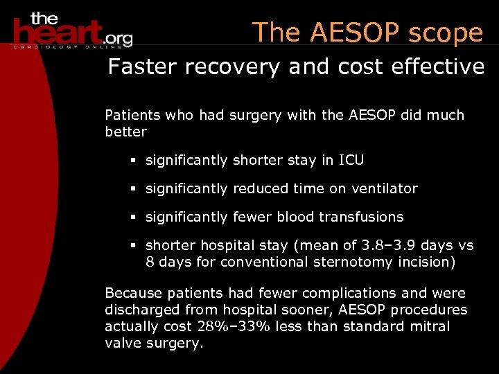 The AESOP scope Faster recovery and cost effective Patients who had surgery with the AESOP did much better § significantly shorter stay in ICU § significantly reduced time on ventilator § significantly fewer blood transfusions § shorter hospital stay (mean of 3. 8– 3. 9 days vs 8 days for conventional sternotomy incision) Because patients had fewer complications and were discharged from hospital sooner, AESOP procedures actually cost 28%– 33% less than standard mitral valve surgery.