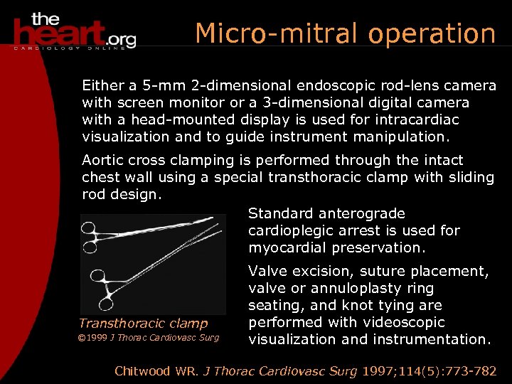 Micro-mitral operation Either a 5 -mm 2 -dimensional endoscopic rod-lens camera with screen monitor or a 3 -dimensional digital camera with a head-mounted display is used for intracardiac visualization and to guide instrument manipulation. Aortic cross clamping is performed through the intact chest wall using a special transthoracic clamp with sliding rod design. Standard anterograde cardioplegic arrest is used for myocardial preservation. Transthoracic clamp © 1999 J Thorac Cardiovasc Surg Valve excision, suture placement, valve or annuloplasty ring seating, and knot tying are performed with videoscopic visualization and instrumentation. Chitwood WR. J Thorac Cardiovasc Surg 1997; 114(5): 773 -782