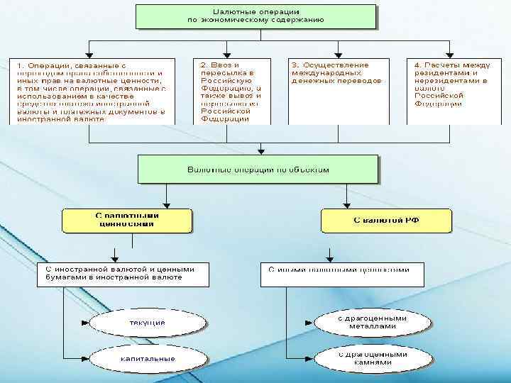 Группы валютных операций операции с иностранной валютой и ценными бумагами в иностранной валюте операции с драгоценными металлами, драгоценными камнями, жемчугом текущие операции валютные операции, связанные с движением капитала (капитальные операции) операции, связанные с расчетами в валюте РФ, между резидентами и нерезидентами специальные правила осуществления таких операций