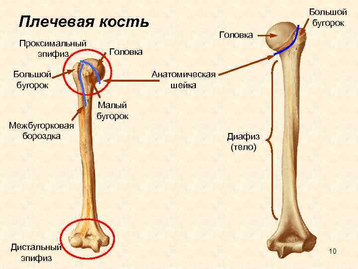 Большой бугорок Плечевая кость Проксимальный эпифиз Головка Большой бугорок Межбугорковая бороздка Дистальный эпифиз Головка Анатомическая шейка Малый бугорок Диафиз (тело) 10