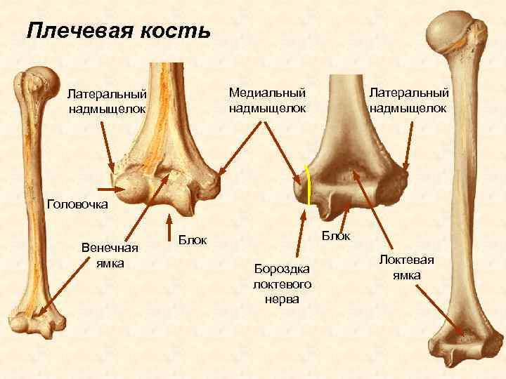 Плечевая кость Медиальный надмыщелок Латеральный надмыщелок Головочка Венечная ямка Блок Бороздка локтевого нерва Локтевая ямка 11