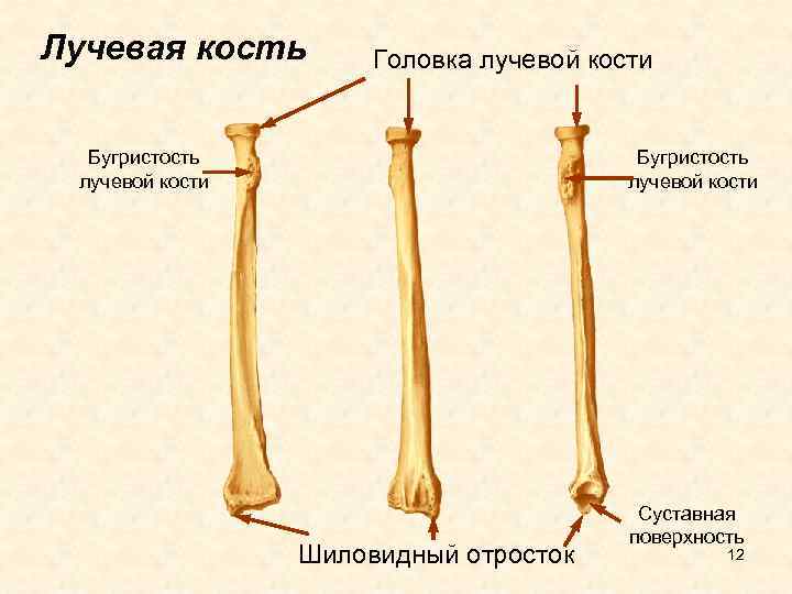 Лучевая кость Головка лучевой кости Бугристость лучевой кости Шиловидный отросток Суставная поверхность 12