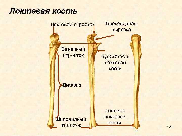 Локтевая кость Локтевой отросток Венечный отросток Блоковидная вырезка Бугристость локтевой кости Диафиз Шиловидный отросток Головка локтевой кости 13