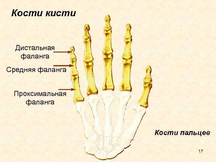 Кости кисти Дистальная фаланга Средняя фаланга Проксимальная фаланга Кости пальцев 17