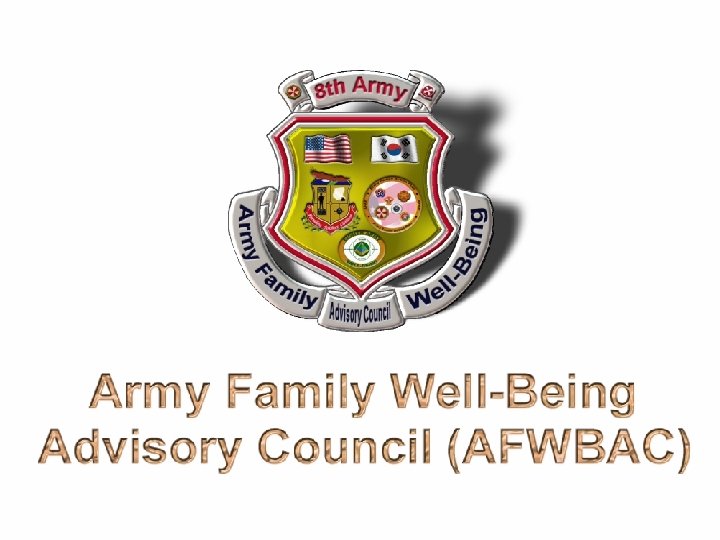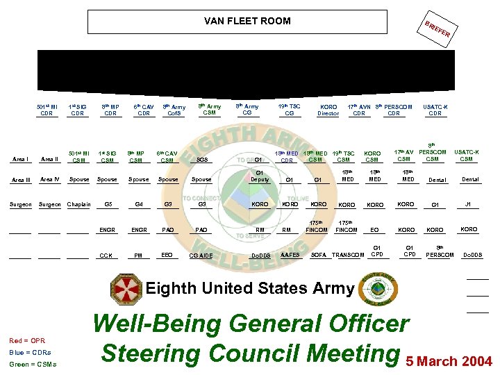 VAN FLEET ROOM 501 st MI CDR 1 st SIG CDR 8 th MP CDR 6 th CAV CDR 8 th Army Cof. S 8 th Army CSM 8 th Army CG 501 st MI 1 st SIG 8 th MP 6 th CAV CSM CSM SGS G 1 19 th TSC CG 18 th MED BR KORO Director 17 th AVN 8 th PERSCOM CDR 18 th MED 19 th TSC CSM KORO CSM IEF ER USATC-K CDR 8 th 17 th AV PERSCOM CSM USATC-K CSM Area III Area IV Spouse Spouse G 1 Deputy G 1 18 th MED Surgeon Chaplain G 5 G 4 G 3 KORO KORO G 1 J 1 ENGR PAO RM 175 th FINCOM EO KORO CCK PM EEO CG AIDE Do. DDS CDR RM AAFES 175 th FINCOM SOFA TRANSCOM G 1 CPD 18 th MED G 1 CPD Dental 8 th PERSCOM Dental Do. DDS Eighth United States Army Red = OPR Blue = CDRs Green = CSMs Well-Being General Officer Steering Council Meeting 5 March 2004