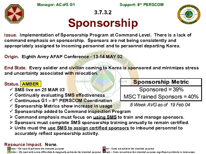 Manager: ACof. S G 1 Support: 8 th PERSCOM 3. 7. 3. 2 Sponsorship Issue. Implementation of Sponsorship Program at Command Level. There is a lack of command emphasis on sponsorship. Sponsors are not being consistently and appropriately assigned to incoming personnel and to personnel departing Korea. Origin. Eighth Army AFAP Conference - 13 -14 MAY 02 End State. Every soldier and civilian coming to Korea is sponsored and minimizes stress and uncertainty associated with relocation. Status. AMBER ü SMS live on 25 MAR 03 ü Continually evaluating SMS effectiveness ü Continuous G 1 – 8 th PERSCOM Coordination ü Sponsorship Metrics show increase in usage ü Sponsorship added to Command Inspection Program Ø Command emphasis must focus on using SMS to train and manage sponsors. Ø Sponsors must complete SMS sponsorship training annually to remain certified. Ø Units must the use SMS to assign certified sponsors to inbound personnel to accurately reflect sponsorship activity. Resource Impact. None. G reen – On track & achieves the intended purpose A mber – On track with some difficulties & marginally achieves the intended purpose R ed – Does not achieve the intended purpose B lack – Does not achieve the intended purpose, significant problems in most areas