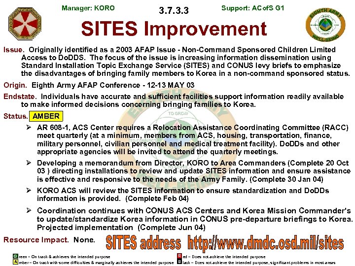 Manager: KORO 3. 7. 3. 3 Support: ACof. S G 1 SITES Improvement Issue. Originally identified as a 2003 AFAP Issue - Non-Command Sponsored Children Limited Access to Do. DDS. The focus of the issue is increasing information dissemination using Standard Installation Topic Exchange Service (SITES) and CONUS levy briefs to emphasize the disadvantages of bringing family members to Korea in a non-command sponsored status. Origin. Eighth Army AFAP Conference - 12 -13 MAY 03 Endstate. Individuals have accurate and sufficient facilities support information readily available to make informed decisions concerning bringing families to Korea. Status. AMBER Ø AR 608 -1, ACS Center requires a Relocation Assistance Coordinating Committee (RACC) meet quarterly (at a minimum, members from ACS, housing, transportation, finance, military personnel, civilian personnel and medical treatment facility). Do. DDs and other appropriate agencies will be invited to attend the quarterly meetings. Ø Developing a memorandum from Director, KORO to Area Commanders (Complete 20 Oct 03 ) directing installations to review and update SITES information and ensure assistance is effective and responsive to the needs of the Army Family. (Complete 30 Jan 04) Ø KORO ACS will review the SITES information to ensure standardization and Do. DDs information is provided. (Complete Feb 04) Ø Coordination continues with CONUS ACS Centers and Korea Mission Commander's to update/standardize Korea information in CONUS pre-departure briefings to Korea. Projected implementation (Complete Jun 04) Resource Impact. None. G reen – On track & achieves the intended purpose A mber – On track with some difficulties & marginally achieves the intended purpose R ed – Does not achieve the intended purpose B lack – Does not achieve the intended purpose, significant problems in most areas