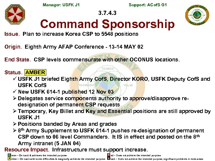 Manager: USFK J 1 Support: ACof. S G 1 3. 7. 4. 3 Command Sponsorship Issue. Plan to increase Korea CSP to 5548 positions Origin. Eighth Army AFAP Conference - 13 -14 MAY 02 End State. CSP levels commensurate with other OCONUS locations. Status. AMBER ü USFK J 1 briefed Eighth Army Cof. S, Director KORO, USFK Deputy Cof. S and USFK Cof. S ü New USFK 614 -1 published 12 Nov 03 Ø Delegates service components authority to approve/disapprove redesignation of permanent CSP requests Ø Temporary, Key Billet and Key and Essential positions are still approved by USFK J 1 Ø Positions banded by Areas and grades Ø 8 th Army Supplement to USFK 614 -1 pushes re-designation of permanent CSP down to 06 level Commanders. It IS in effect and posted on the 8 th Army intranet (5 JAN 04) Resource Impact. Infrastructure must support increase. G reen – On track & achieves the intended purpose A mber – On track with some difficulties & marginally achieves the intended purpose R ed – Does not achieve the intended purpose B lack – Does not achieve the intended purpose, significant problems in most areas