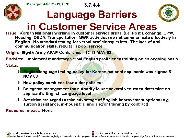 Manager: ACof. S G 1, CPD 3. 7. 4. 4 Language Barriers in Customer Service Areas Issue. Korean Nationals working in customer service areas, (I. e. Post Exchange, DPW, Housing, DECA, Transportation, MWR activities) do not communicate effectively in English. No standard testing for verbal proficiency exists. The lack of oral communication skills, results in poor service. Origin. Eighth Army AFAP Conference - 12 -13 MAY 03 Endstate. Implement mandatory verbal English proficiency training on an ongoing basis. Status. GREEN Ø English language testing policy for Korean national applicants was signed 5 NOV 03 Ø New policy combines four older policies Ø Delegates management the authority to use several venues to determine an applicant’s English Language level Ø Activities are urged to take advantage of English improvement options (e. g. Tuition assistance, in-house training and/or training by contract) Resource Impact. None. G reen – On track & achieves the intended purpose A mber – On track with some difficulties & marginally achieves the intended purpose R ed – Does not achieve the intended purpose B lack – Does not achieve the intended purpose, significant problems in most areas