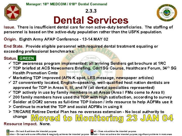 Manager: 18 th MEDCOM / 618 th Dental Command 2. 3. 3 Dental Services Issue. There is insufficient dental care for non active-duty beneficiaries. The staffing of personnel is based on the active-duty population rather than the USFK population. Origin. Eighth Army AFAP Conference - 13 -14 MAY 02 End State. Provide eligible personnel with required dental treatment equaling or exceeding professional benchmarks. Status. GREEN ü TDP awareness program implemented; all arriving Soldiers get brochure at 1 RC ü TDP briefed at ACS Newcomers Briefing, Cdr/1 SG Course, Healthcare Forum, 34 th SG Health Promotion Cmte ü Marketing TDP improved (AFN-K spot, LES message, newspaper articles) ü 27 conveniently located, English–speaking, well-qualified host nation dentists are approved for TDP in Areas II, III, and IV (all dental specialties represented) ü TDP actively in use by family members in all Areas (Area I FMs come to Area II) ü 200 family members have used the TDP with high satisfaction, according to survey ü Soldier at DC#2 serves as full-time TDP liaison / info resource to help ADFMs use it Ø Continue to market the TDP and assist ADFMs in using it Ø TRICARE Retiree Dental Plan has no overseas extension - No local authority to change Resource Impact. None. G reen – On track & achieves the intended purpose A mber – On track with some difficulties & marginally achieves the intended purpose R ed – Does not achieve the intended purpose B lack – Does not achieve the intended purpose, significant problems in most areas