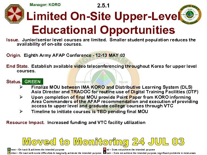 Manager: KORO 2. 5. 1 Limited On-Site Upper-Level Educational Opportunities Issue. Junior/senior level courses are limited. Smaller student population reduces the availability of on-site courses. Origin. Eighth Army AFAP Conference - 12 -13 MAY 03 End State. Establish available video teleconferencing throughout Korea for upper level courses. Status. GREEN Ø Finalize MOU between IMA KORO and Distributive Learning System (DLS) Asia Director and TRADOC for routine use of Digital Training Facilities (DTF) Ø Upon completion of final MOU provide Point Paper from KORO informing Area Commanders of the AFAP recommendation and execution of providing access to upper level and graduate college courses through VTC Ø Timeline to initiate courses is TBD pending final MOU Resource Impact. Increased funding and VTC facility utilization G reen – On track & achieves the intended purpose A mber – On track with some difficulties & marginally achieves the intended purpose R ed – Does not achieve the intended purpose B lack – Does not achieve the intended purpose, significant problems in most areas