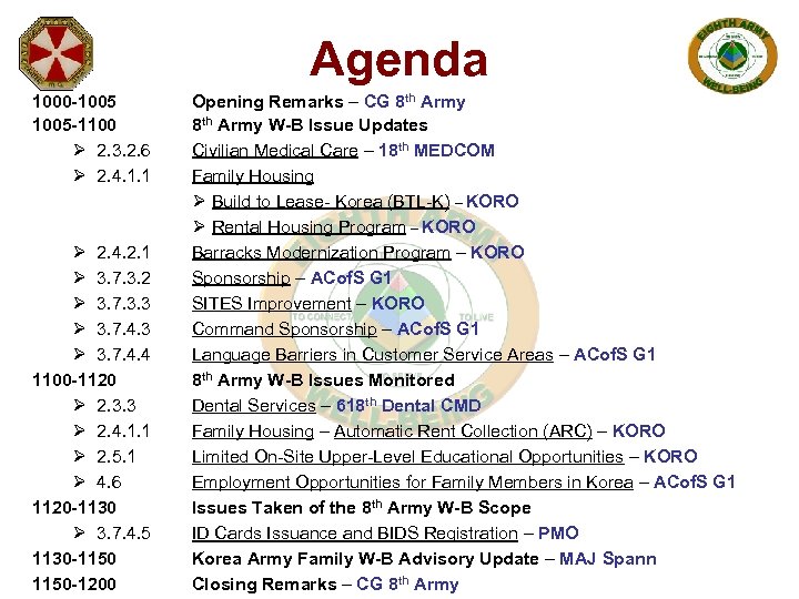 Agenda 1000 -1005 1005 -1100 Ø 2. 3. 2. 6 Ø 2. 4. 1. 1 Ø 2. 4. 2. 1 Ø 3. 7. 3. 2 Ø 3. 7. 3. 3 Ø 3. 7. 4. 4 1100 -1120 Ø 2. 3. 3 Ø 2. 4. 1. 1 Ø 2. 5. 1 Ø 4. 6 1120 -1130 Ø 3. 7. 4. 5 1130 -1150 -1200 Opening Remarks – CG 8 th Army W-B Issue Updates Civilian Medical Care – 18 th MEDCOM Family Housing Ø Build to Lease- Korea (BTL-K) – KORO Ø Rental Housing Program – KORO Barracks Modernization Program – KORO Sponsorship – ACof. S G 1 SITES Improvement – KORO Command Sponsorship – ACof. S G 1 Language Barriers in Customer Service Areas – ACof. S G 1 8 th Army W-B Issues Monitored Dental Services – 618 th Dental CMD Family Housing – Automatic Rent Collection (ARC) – KORO Limited On-Site Upper-Level Educational Opportunities – KORO Employment Opportunities for Family Members in Korea – ACof. S G 1 Issues Taken of the 8 th Army W-B Scope ID Cards Issuance and BIDS Registration – PMO Korea Army Family W-B Advisory Update – MAJ Spann Closing Remarks – CG 8 th Army