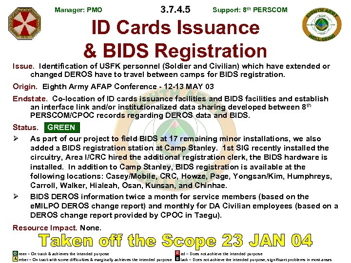 Manager: PMO 3. 7. 4. 5 Support: 8 th PERSCOM ID Cards Issuance & BIDS Registration Issue. Identification of USFK personnel (Soldier and Civilian) which have extended or changed DEROS have to travel between camps for BIDS registration. Origin. Eighth Army AFAP Conference - 12 -13 MAY 03 Endstate. Co-location of ID cards issuance facilities and BIDS facilities and establish an interface link and/or institutionalized data sharing developed between 8 th PERSCOM/CPOC records regarding DEROS data and BIDS. Status. GREEN Ø As part of our project to field BIDS at 17 remaining minor installations, we also added a BIDS registration station at Camp Stanley. 1 st SIG recently installed the circuitry, Area I/CRC hired the additional registration clerk, the BIDS hardware is installed. In addition to Camp Stanley, BIDS registration is available at the following locations: Casey/Mobile, CRC, Howze, Page, Yongsan/Kim, Humphreys, Carroll, Walker, Hialeah, Osan, Kunsan, and Chinhae. Ø BIDS DEROS information twice a month for service members (based on the e. MILPO DEROS change report) and monthly for DA Civilian employees (based on a DEROS change report provided by CPOC in Taegu). Resource Impact. None. G reen – On track & achieves the intended purpose A mber – On track with some difficulties & marginally achieves the intended purpose R ed – Does not achieve the intended purpose B lack – Does not achieve the intended purpose, significant problems in most areas