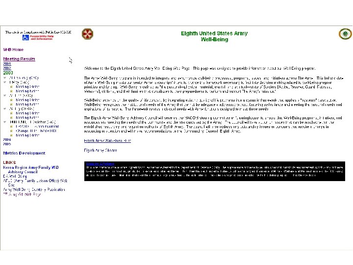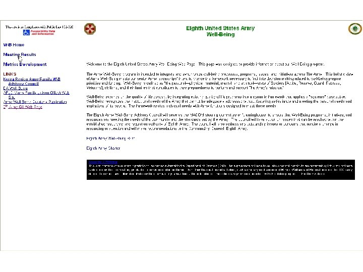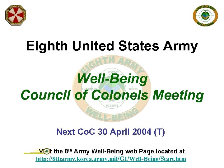Eighth United States Army Well-Being Council of Colonels Meeting Next Co. C 30 April 2004 (T) Visit the 8 th Army Well-Being web Page located at http: //8 tharmy. korea. army. mil/G 1/Well-Being/Start. htm