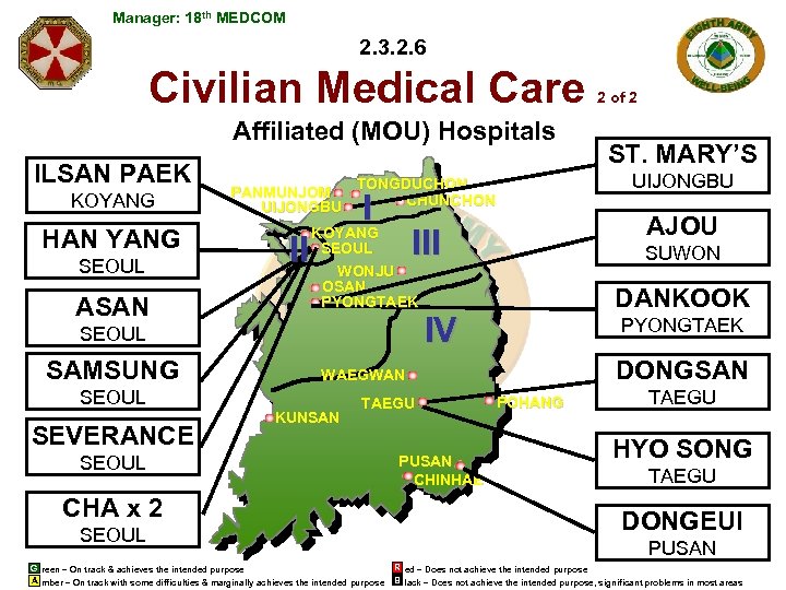 Manager: 18 th MEDCOM 2. 3. 2. 6 Civilian Medical Care Affiliated (MOU) Hospitals ILSAN PAEK KOYANG HAN YANG SEOUL ASAN II WONJU OSAN PYONGTAEK SEOUL SAMSUNG SUWON DANKOOK IV PYONGTAEK DONGSAN WAEGWAN SEOUL SEVERANCE AJOU III KOYANG SEOUL KUNSAN TAEGU SEOUL CHA x 2 SEOUL G reen – On track & achieves the intended purpose A mber – On track with some difficulties & marginally achieves the intended purpose PUSAN CHINHAE ST. MARY’S UIJONGBU TONGDUCHON PANMUNJOM CHUNCHON UIJONGBU I 2 of 2 POHANG TAEGU HYO SONG TAEGU DONGEUI PUSAN R ed – Does not achieve the intended purpose B lack – Does not achieve the intended purpose, significant problems in most areas