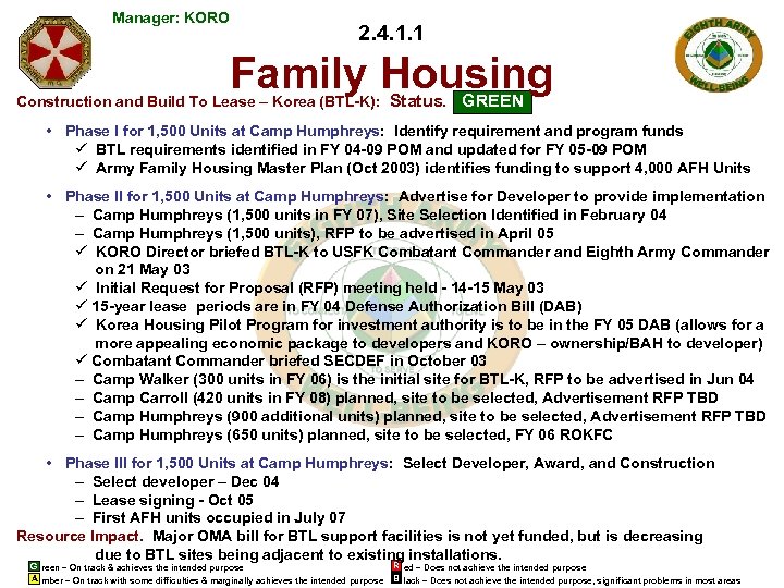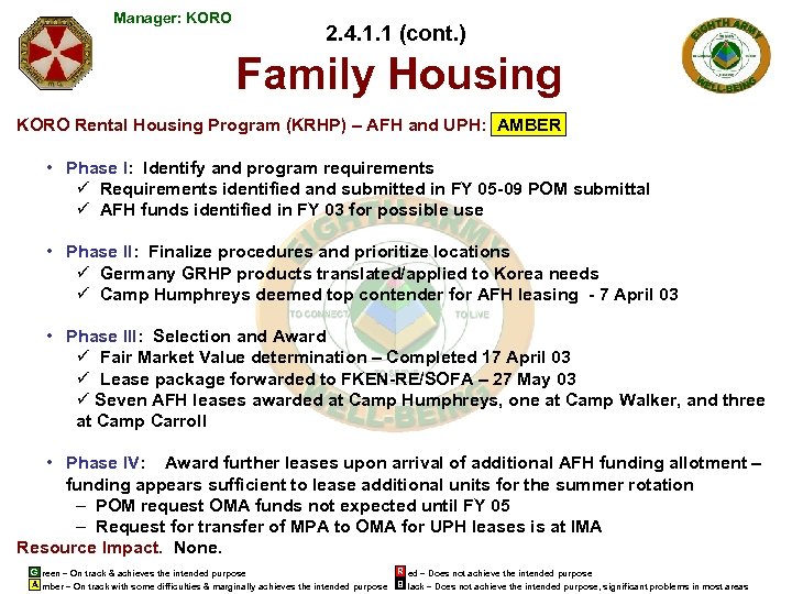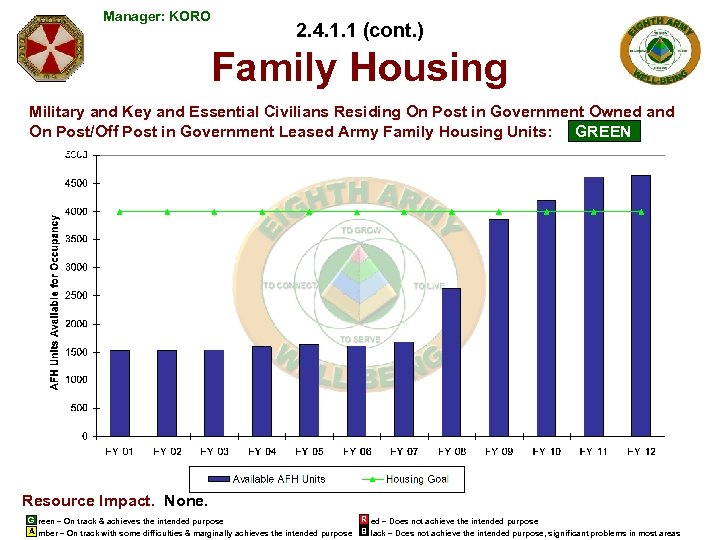 Manager: KORO 2. 4. 1. 1 (cont. ) Family Housing Military and Key and Essential Civilians Residing On Post in Government Owned and On Post/Off Post in Government Leased Army Family Housing Units: GREEN Resource Impact. None. G reen – On track & achieves the intended purpose A mber – On track with some difficulties & marginally achieves the intended purpose R ed – Does not achieve the intended purpose B lack – Does not achieve the intended purpose, significant problems in most areas