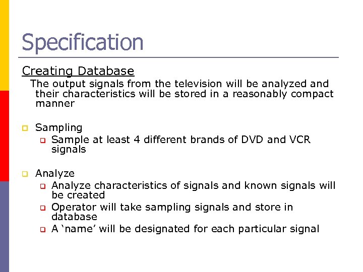 Specification Creating Database The output signals from the television will be analyzed and their characteristics will be stored in a reasonably compact manner p Sampling q Sample at least 4 different brands of DVD and VCR signals q Analyze characteristics of signals and known signals will be created q Operator will take sampling signals and store in database q A ‘name’ will be designated for each particular signal
