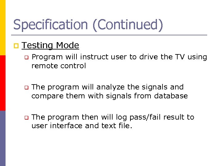 Specification (Continued) p Testing Mode q q q Program will instruct user to drive the TV using remote control The program will analyze the signals and compare them with signals from database The program then will log pass/fail result to user interface and text file.