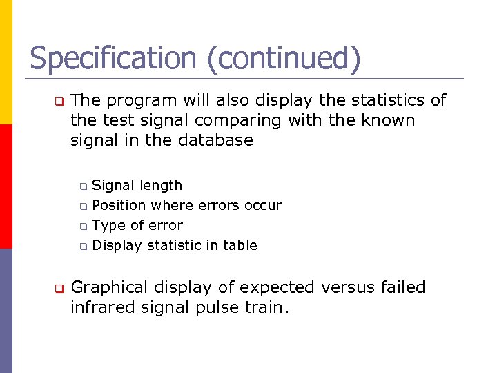 Specification (continued) q The program will also display the statistics of the test signal comparing with the known signal in the database Signal length q Position where errors occur q Type of error q Display statistic in table q q Graphical display of expected versus failed infrared signal pulse train.