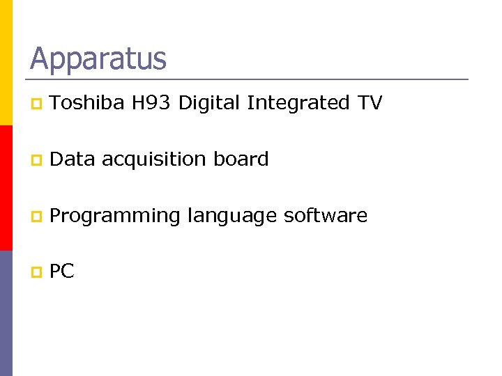 Apparatus p Toshiba H 93 Digital Integrated TV p Data acquisition board p Programming language software p PC