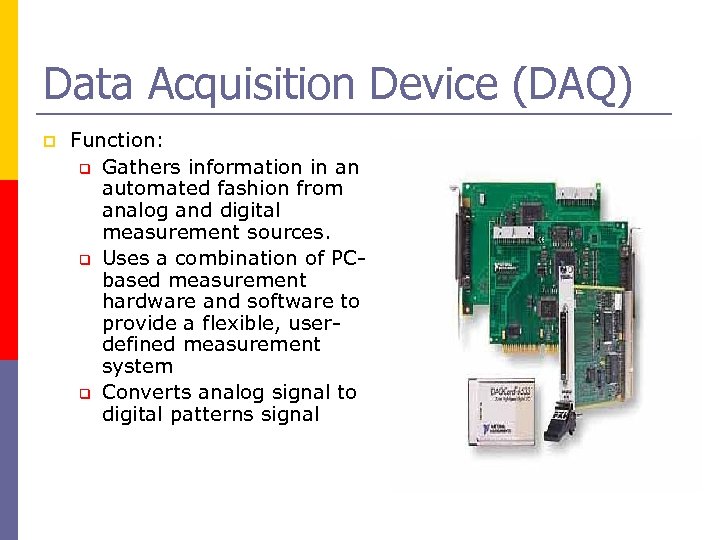 Data Acquisition Device (DAQ) p Function: q Gathers information in an automated fashion from analog and digital measurement sources. q Uses a combination of PCbased measurement hardware and software to provide a flexible, userdefined measurement system q Converts analog signal to digital patterns signal