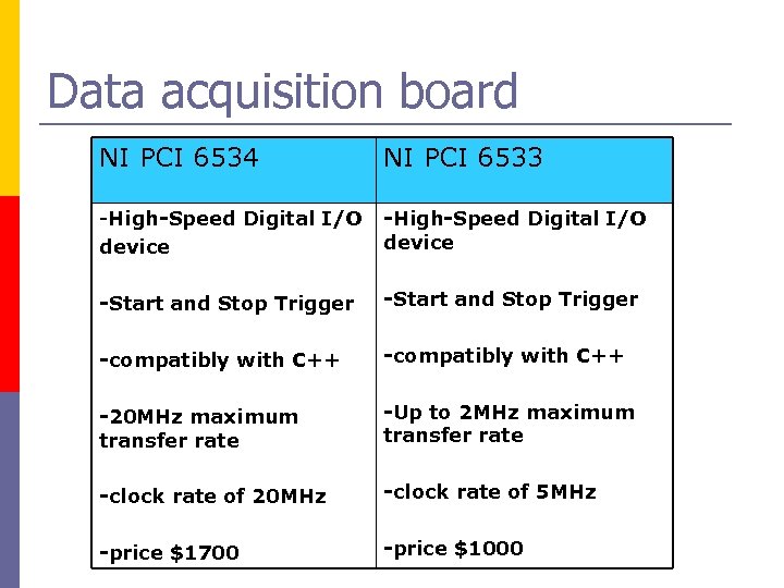 Data acquisition board NI PCI 6534 NI PCI 6533 -High-Speed Digital I/O device -Start and Stop Trigger -compatibly with C++ -20 MHz maximum transfer rate -Up to 2 MHz maximum transfer rate -clock rate of 20 MHz -clock rate of 5 MHz -price $1700 -price $1000