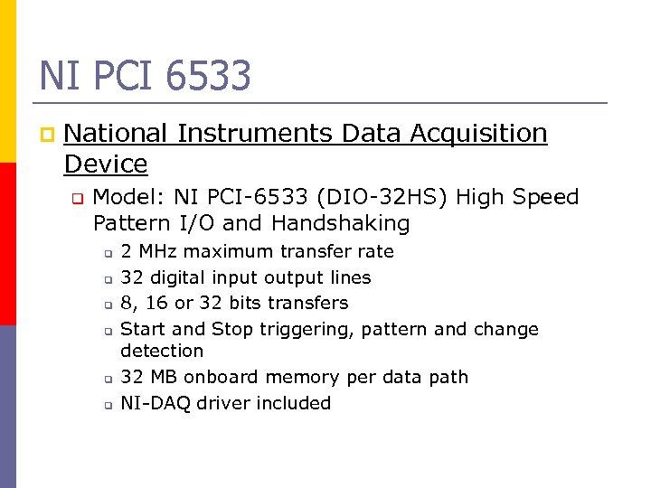 NI PCI 6533 p National Instruments Data Acquisition Device q Model: NI PCI-6533 (DIO-32 HS) High Speed Pattern I/O and Handshaking q q q 2 MHz maximum transfer rate 32 digital input output lines 8, 16 or 32 bits transfers Start and Stop triggering, pattern and change detection 32 MB onboard memory per data path NI-DAQ driver included