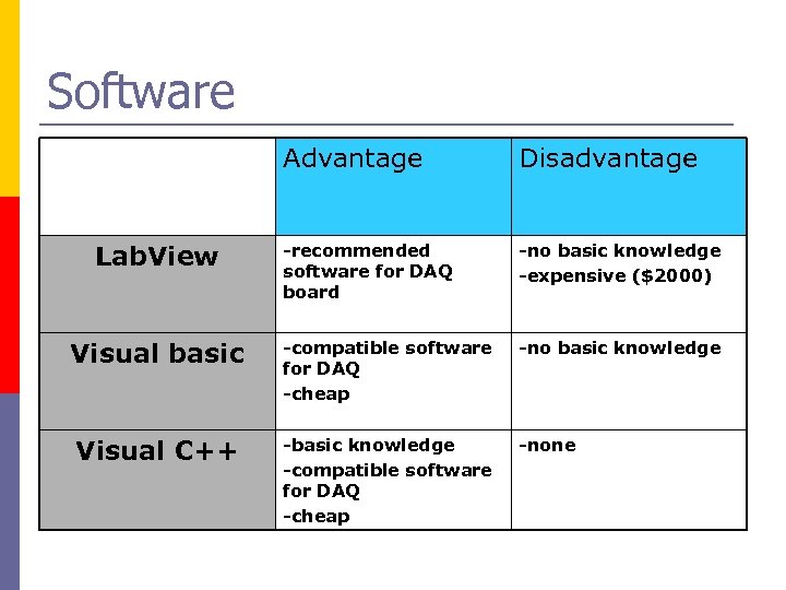 Software Advantage Disadvantage -recommended software for DAQ board -no basic knowledge -expensive ($2000) Visual basic -compatible software for DAQ -cheap -no basic knowledge Visual C++ -basic knowledge -compatible software for DAQ -cheap -none Lab. View