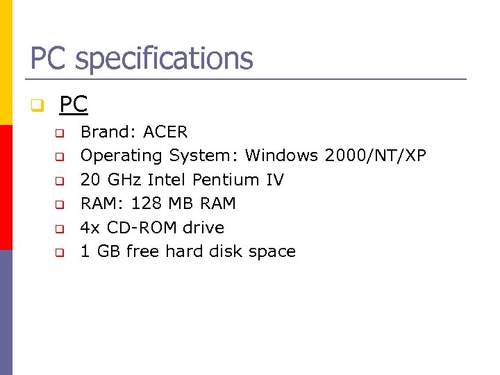 PC specifications q PC q q q Brand: ACER Operating System: Windows 2000/NT/XP 20 GHz Intel Pentium IV RAM: 128 MB RAM 4 x CD-ROM drive 1 GB free hard disk space