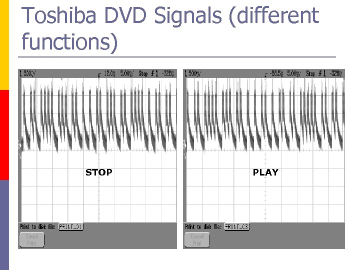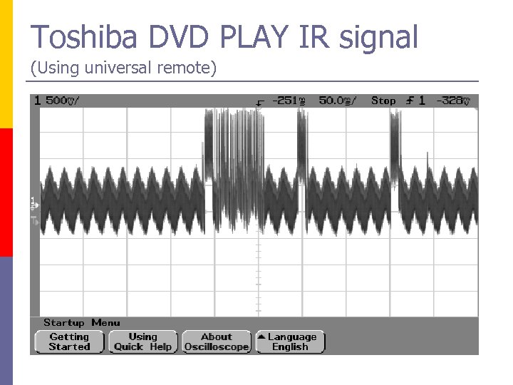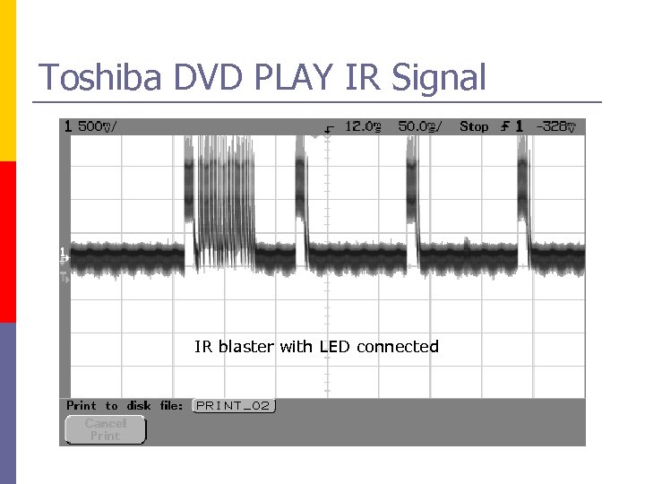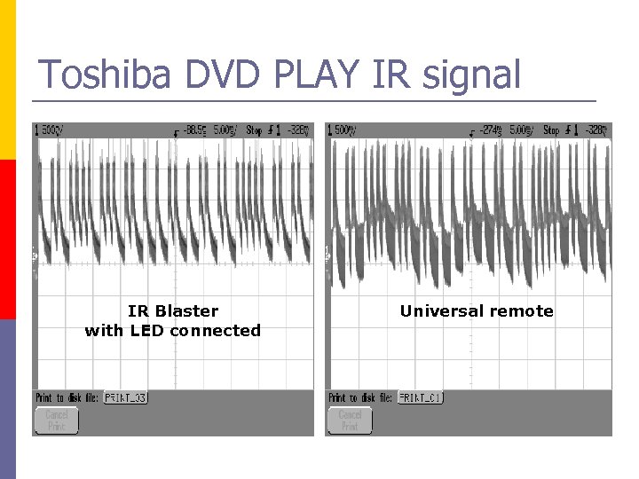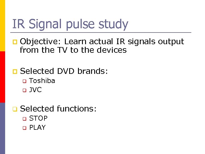 IR Signal pulse study p Objective: Learn actual IR signals output from the TV to the devices p Selected DVD brands: q q q Toshiba JVC Selected functions: q q STOP PLAY