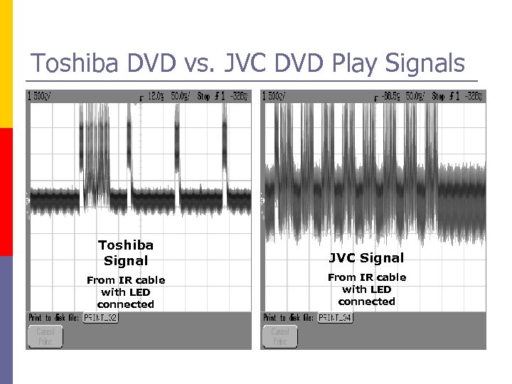 Toshiba DVD vs. JVC DVD Play Signals Toshiba Signal JVC Signal From IR cable with LED connected