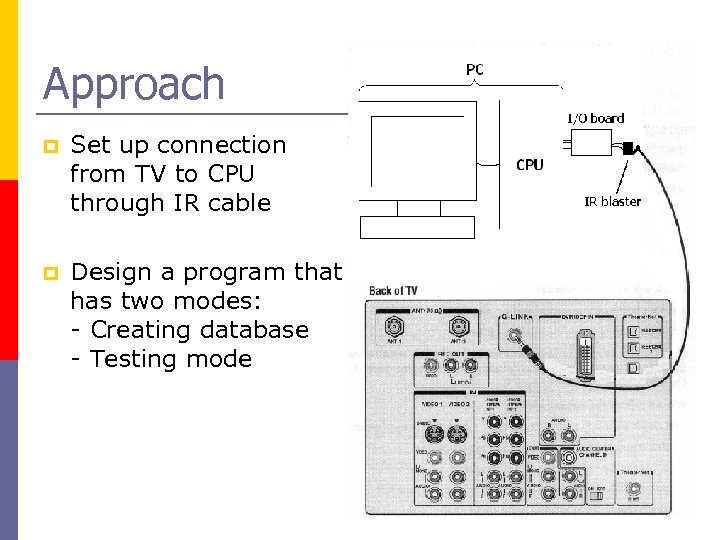 Approach p Set up connection from TV to CPU through IR cable p Design a program that has two modes: - Creating database - Testing mode