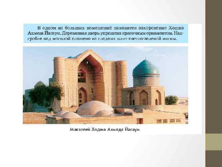 20. Укажите название архитектурного сооружения XIV -XV вв. , о котором Рузбихан пишет следующее: «…одна из самых монументальных построек во всем мире; в архитектуре мавзолея проявлено человеческое искусство до поразительности и восхищении: перед высотой его купола отступает сама пирамида, с ней не может идти в сравнение Яманский замок в городе Сана» . • • • A) Ахмед Йассауи B) Жошы хан C) Айша-Биби D) Акыртас E) Бабаджа-хатун