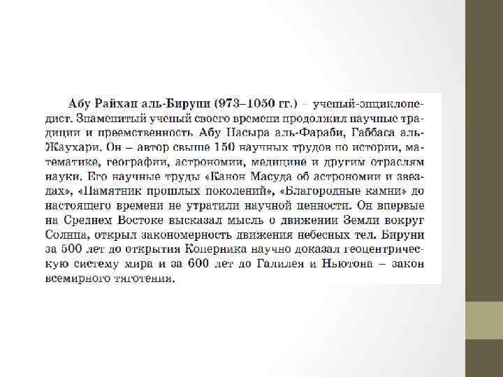 4. Автор свыше 150 научных трудов, доказавший геоцентрическую систему мира до Коперника: • A) Коркут • B) Авиценна • C) Баласагуни • D) аль-Бируни • E) аль-Фараби